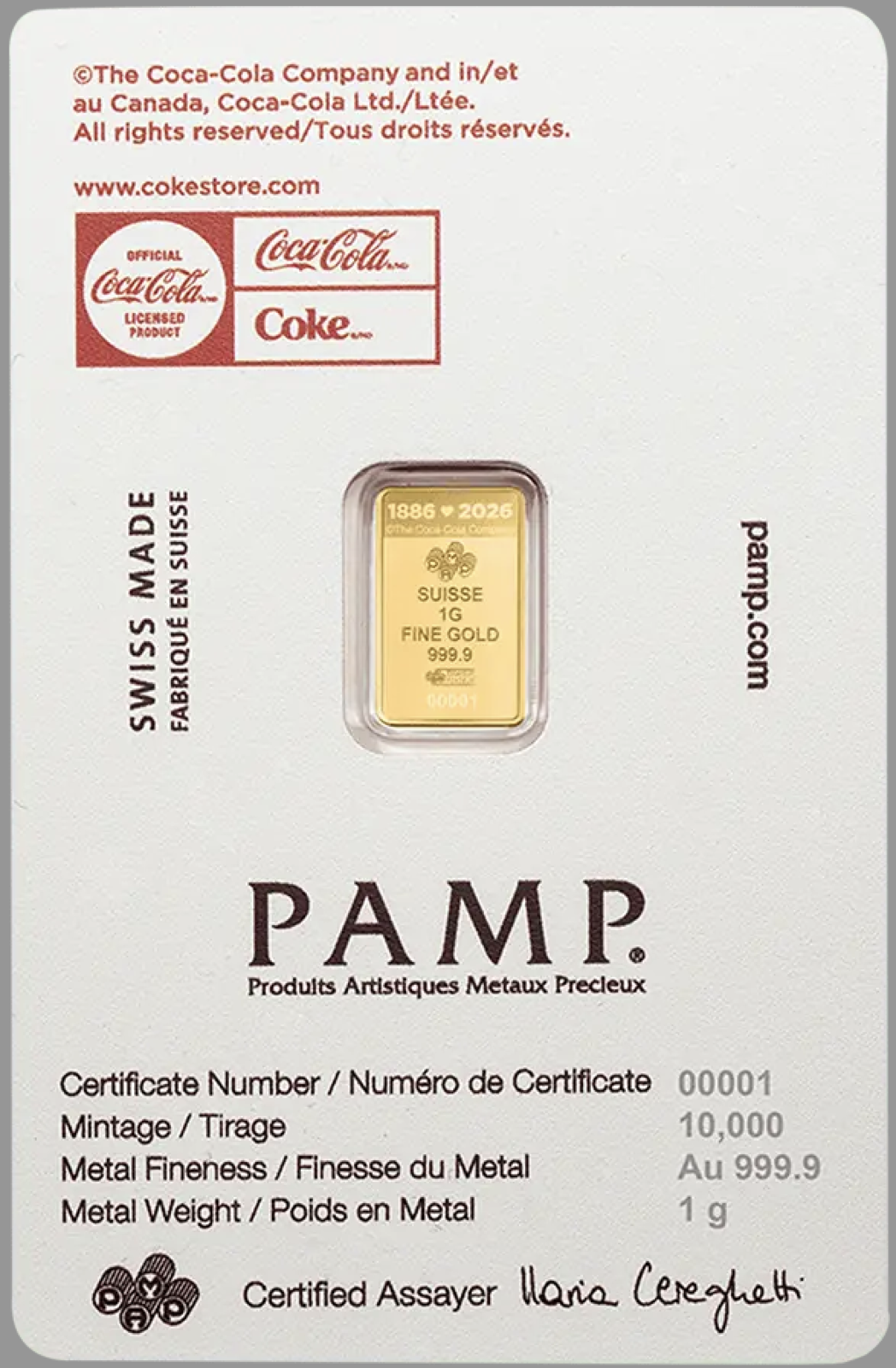 Celebrate your love for Coca-Cola with the stunning 1 gram 2026 Coca-Cola Valentine’s Day Gold Bar. This unique gold bar combines the iconic Coca-Cola branding with the exceptional quality of PAMP Suisse, making it a perfect gift or addition to any collection.