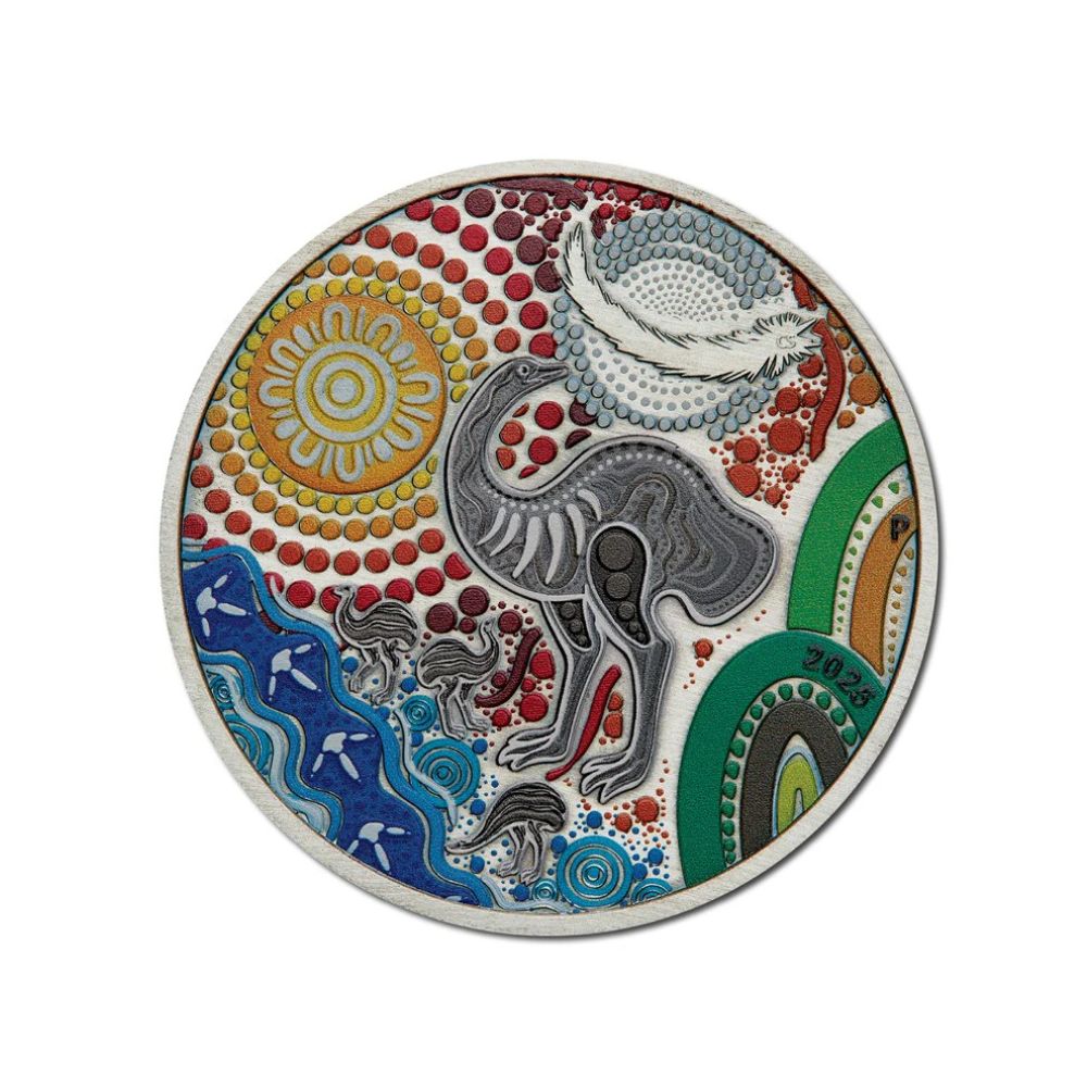The Emu Utingat 2025 2oz Silver Antiqued Coloured Coin continues Perth Mint’s series of Aboriginal style painted coins. The emu, known as “Utingat” in the Kalkadoon language, is Australia’s largest native bird. Previous releases in this series, including the Black Swan Maali, Kangaroo Yongka, and Kookaburra Kaa Kaa, reached mintage and are all sold out at The Perth Mint.