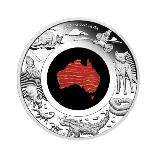 Celebrating Australia’s iconic desert species, the coin depicts (clockwise from top) a cockatoo, a dingo, a taipan snake, a thorny devil, a desert ant, a scorpion, a bilby, a bearded dragon, and a rock wallaby. Also in the design are representations of the sky, sand and rocks, along with The Perth Mint’s ‘P’ mintmark and the coin’s weight, purity, and 2025 year-date.