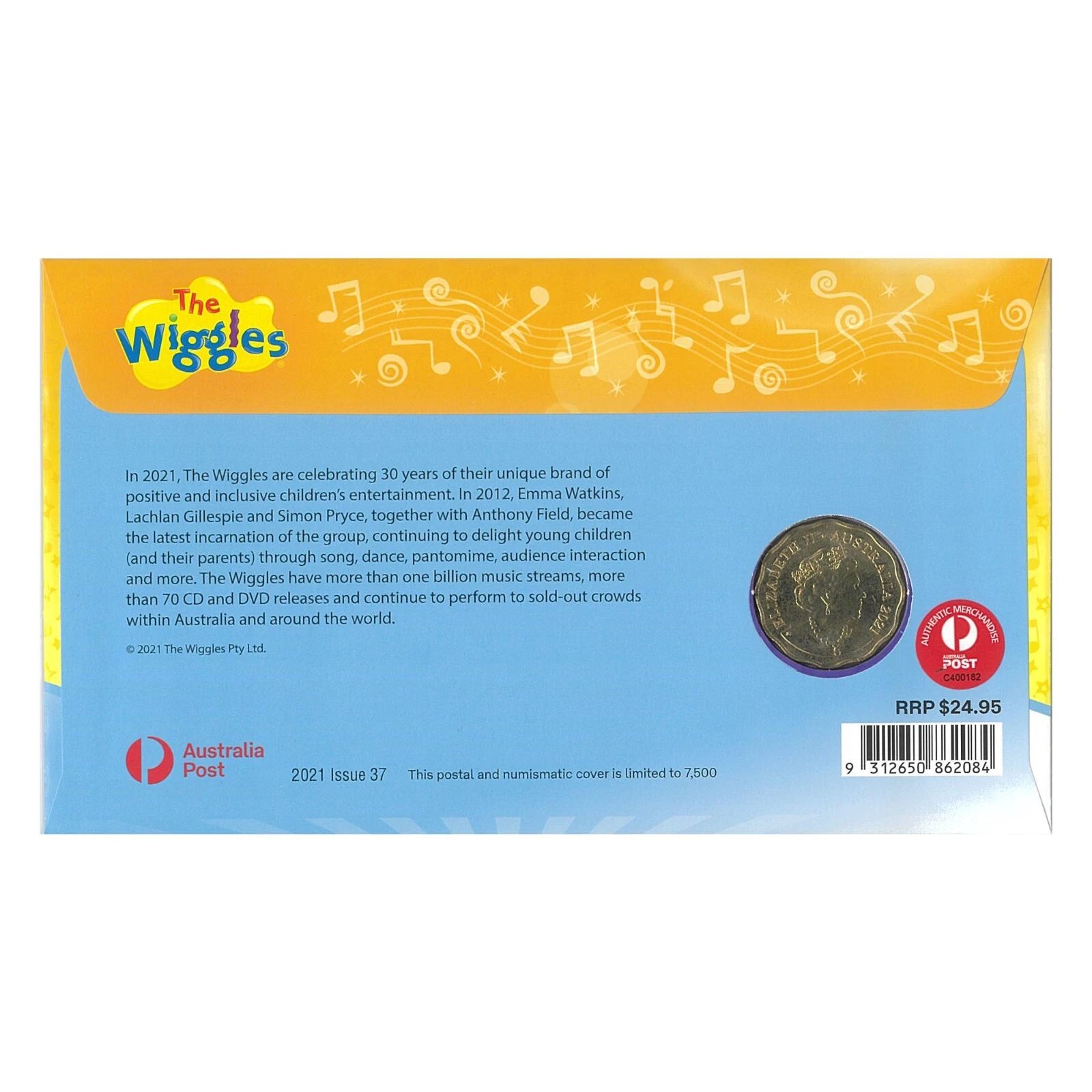 The Wiggles New postal numismatic covers contain a scalloped-edge 30c coin, featuring pictorial envelopes with printed Wiggles MyStamp labels and coins from the Royal Australian Mint.
