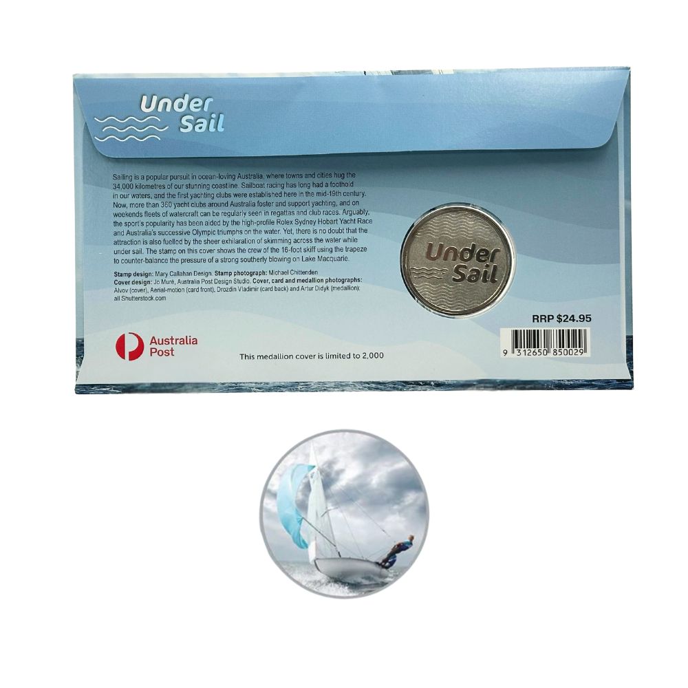 This stamp and medallion cover is a very limited collectable, featuring a pictorial envelope with the $2.20 stamp from the Under Sail stamp issue and related medallion. The stamp is postmarked – First day of issue | 11 January 2022 | Sydney NSW 2000