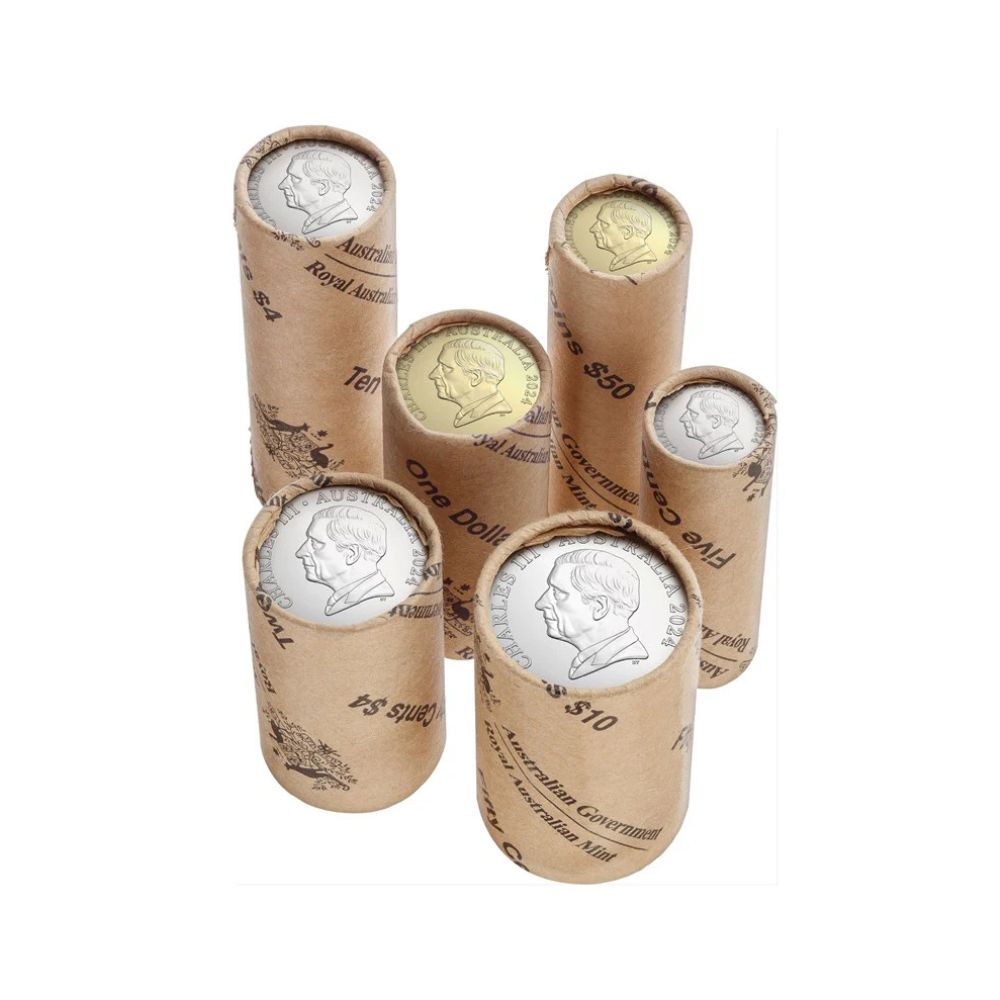The Royal Australian Mint is excited to offer this complete set of 2024 year dated coin rolls in uncirculated conidtion. Marking the first time that the new effigy of His Majesty King Charles III by Daniel Thorne will appear on the obverse of all six standard circulating coins.